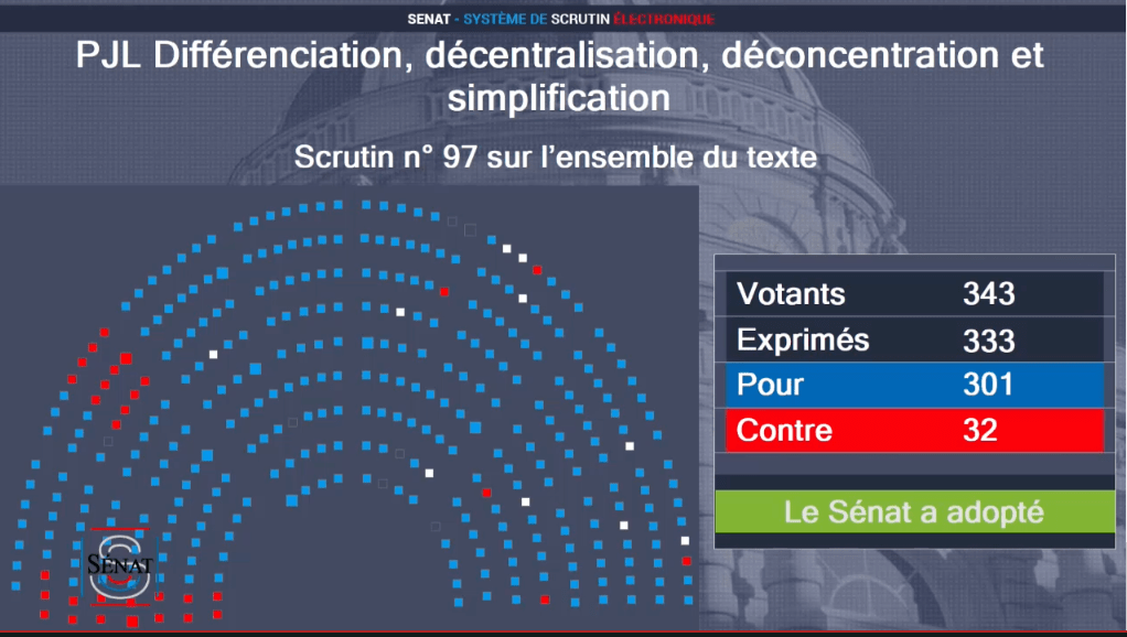 Le Sénat a définitivement adopté le projet de loi relatif à la différenciation, la décentralisation, la déconcentration et portant diverses mesures de simplification de l’action publique locale, par 301 voix pour et 32 voix contre (voir les résultats du scrutin public).
