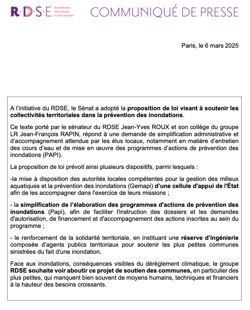 Porté par Jean Yves Roux (RDSE) et Jean-François Rapin (LR), ce texte répond à une demande forte des élus locaux en matière de 𝘀𝗶𝗺𝗽𝗹𝗶𝗳𝗶𝗰𝗮𝘁𝗶𝗼𝗻 𝗮𝗱𝗺𝗶𝗻𝗶𝘀𝘁𝗿𝗮𝘁𝗶𝘃𝗲 𝗲𝘁 𝗱’𝗮𝗰𝗰𝗼𝗺𝗽𝗮𝗴𝗻𝗲𝗺𝗲𝗻𝘁, notamment pour l’entretien des cours d’eau et la mise en œuvre des programmes d’actions de prévention des inondations (PAPI).