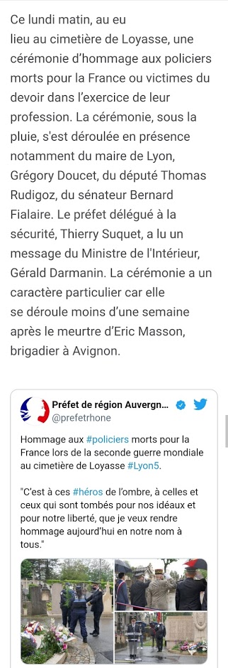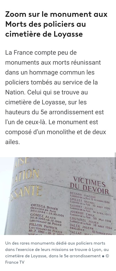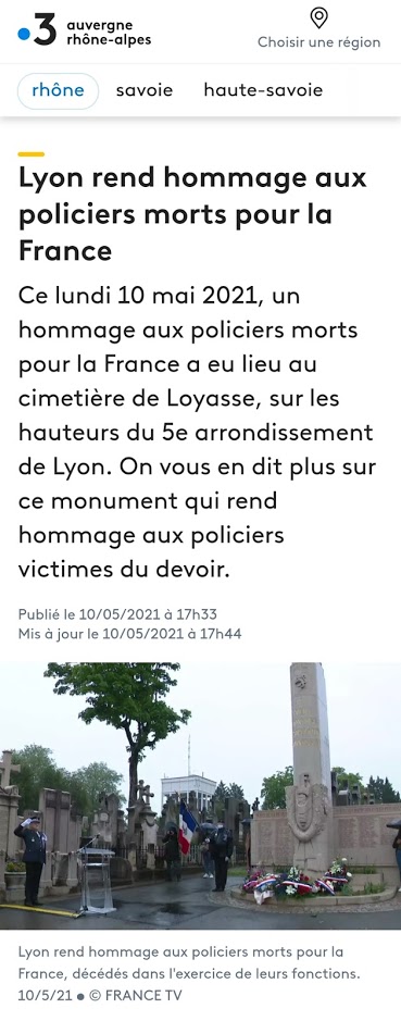 En cette période particulière d’agression des forces de l’ordre, j’ai jugé important de me rendre ce matin, à la cérémonie officielle au monument aux morts de la police Nationale, cimetière de Loyasse, sur invitation de Monsieur Pascal Mailhos, Préfet de Région et de Monsieur Thierry Suchet, Préfet délégué à la sécurité, pour honorer la mémoire des policiers morts pour la France ou victimes du devoir dans l’exercice de leur profession.