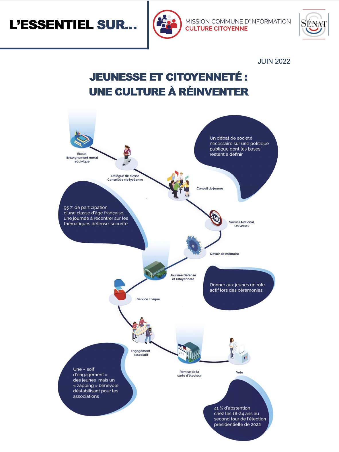 Pour répondre à cette question, la mission d’information du Sénat s’est penchée sur les différentes étapes d’un parcours citoyen qui commence à l’école, qui se poursuit lors de la journée défense et citoyenneté, qui se concrétise à travers l’engagement et qui conduit à exercer des choix politiques à travers le vote ou la participation au débat dans le cadre de la démocratie participative.