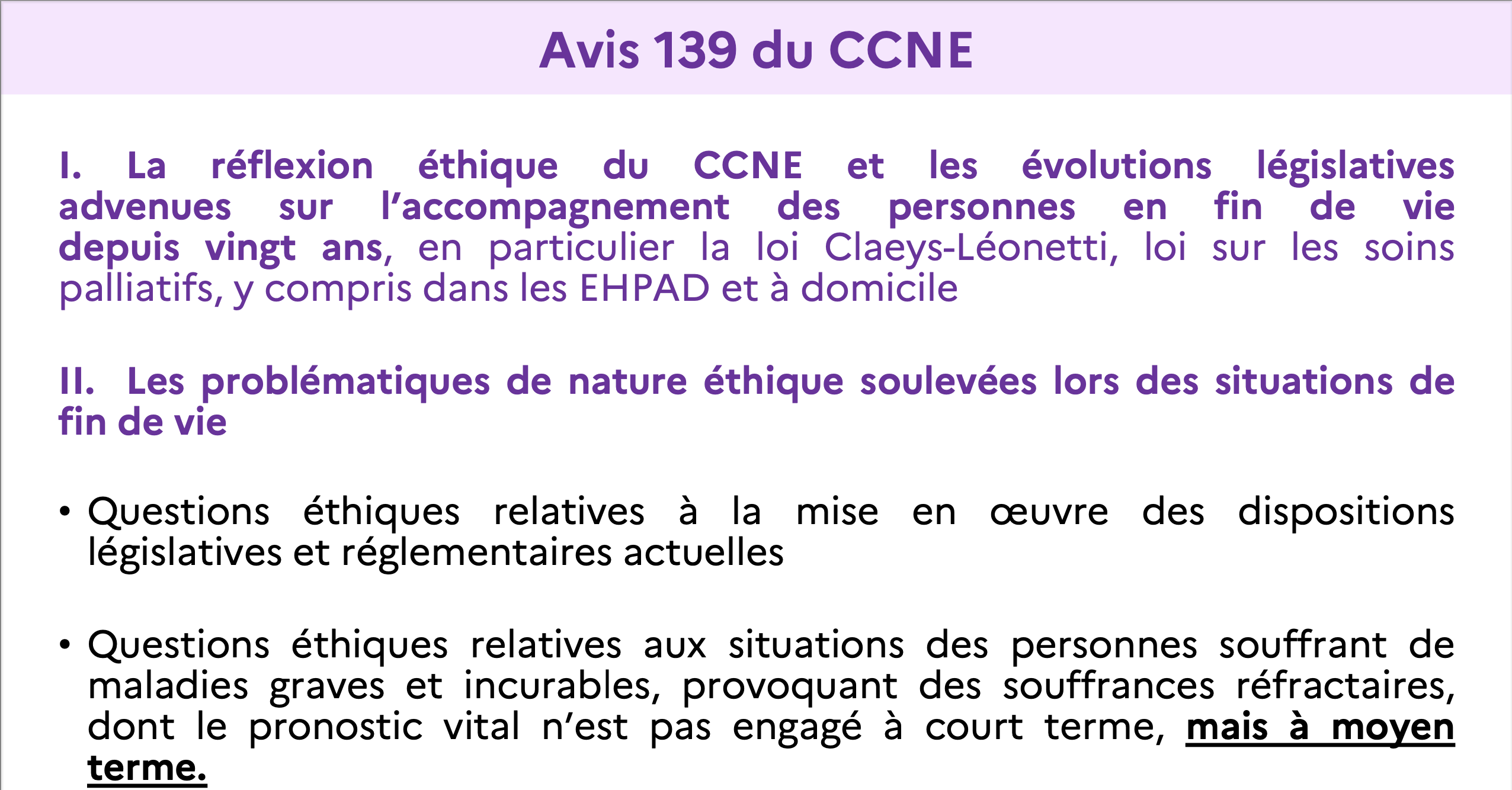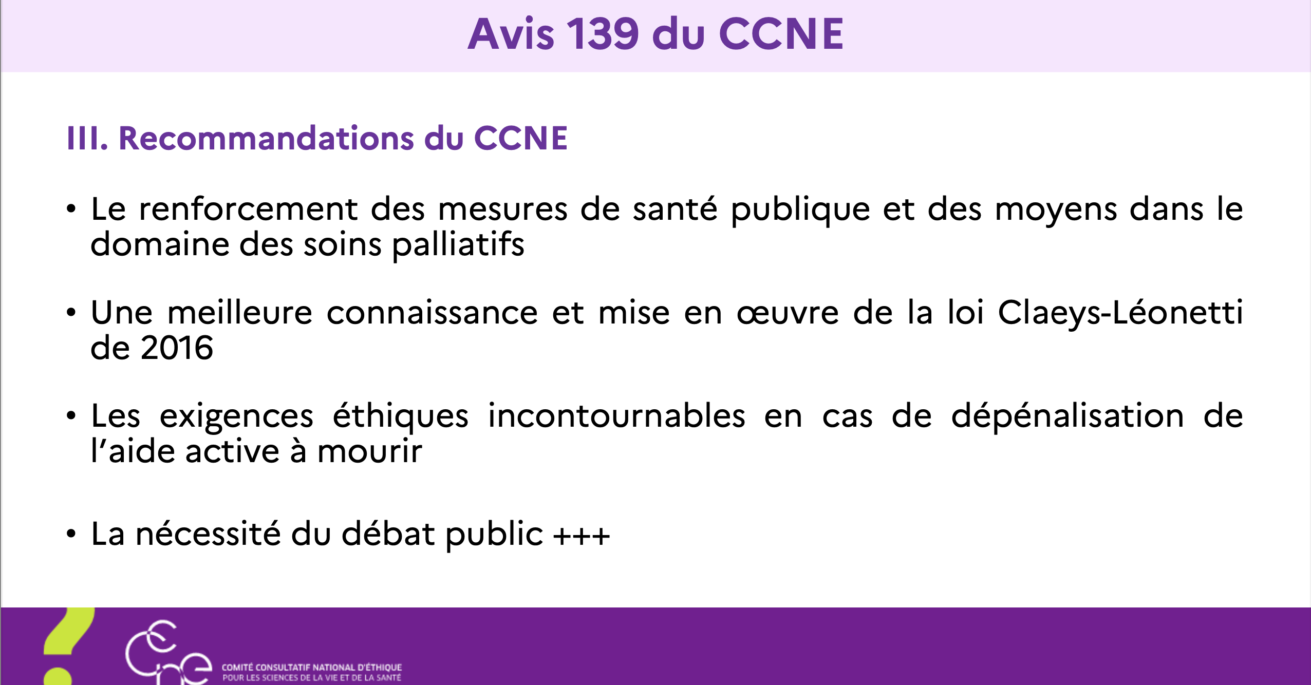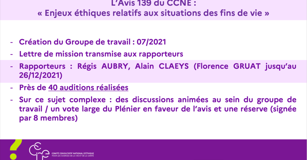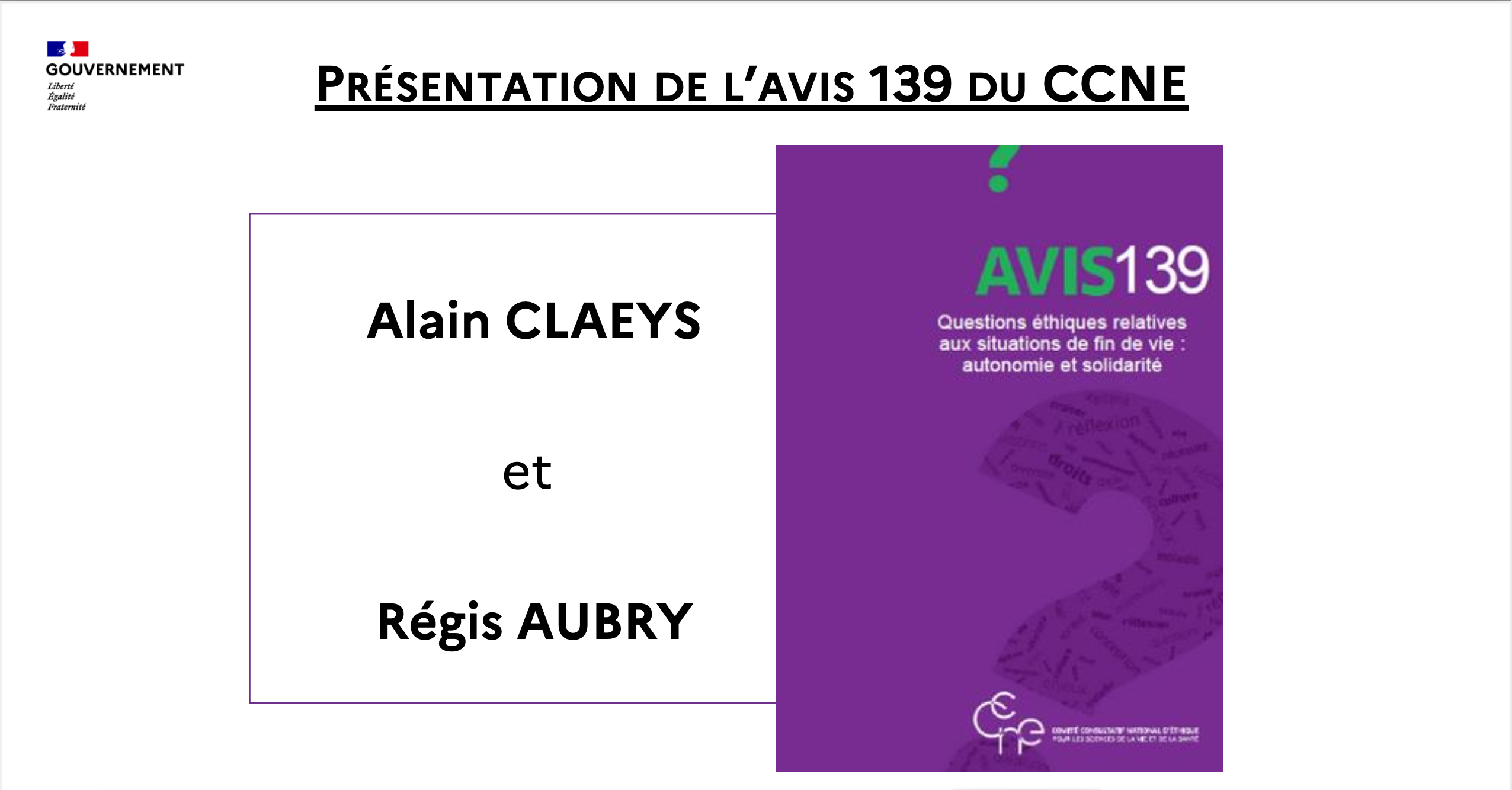 Exposé de l’Avis 139 du Comité Consultatif National d’Éthique (CCNE) sur les « Enjeux éthiques relatifs aux situations des fins de vie » avec la réflexion éthique et les évolutions législatives, les problématiques et les recommandation du CCNE suivi de la présentation des résultat du sondage réalisé dans le cadre du 5ème plan Soins palliatifs et Fin de Vie (SPFV).