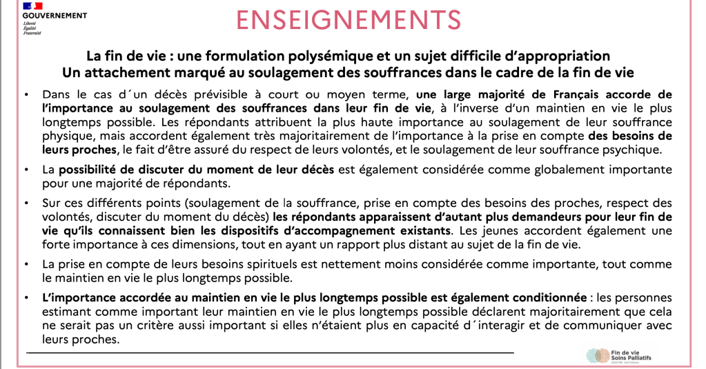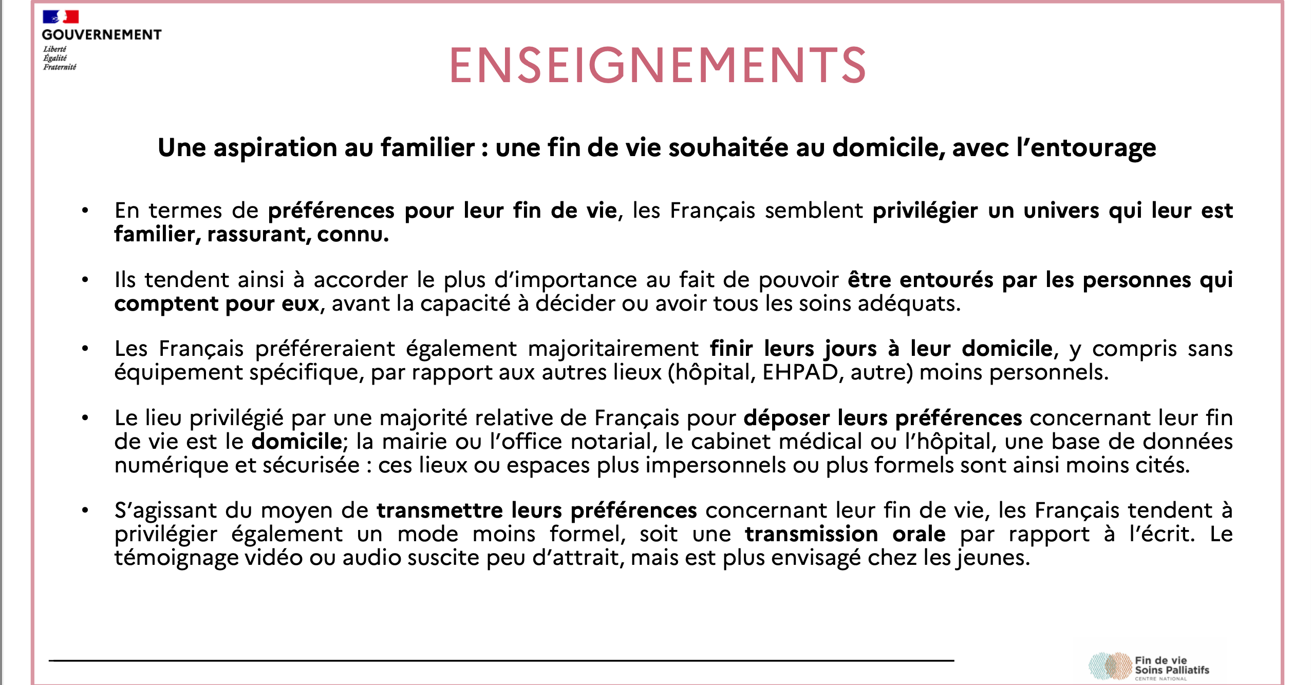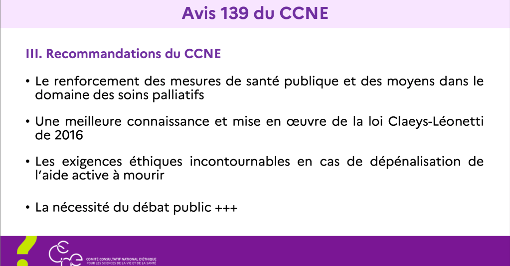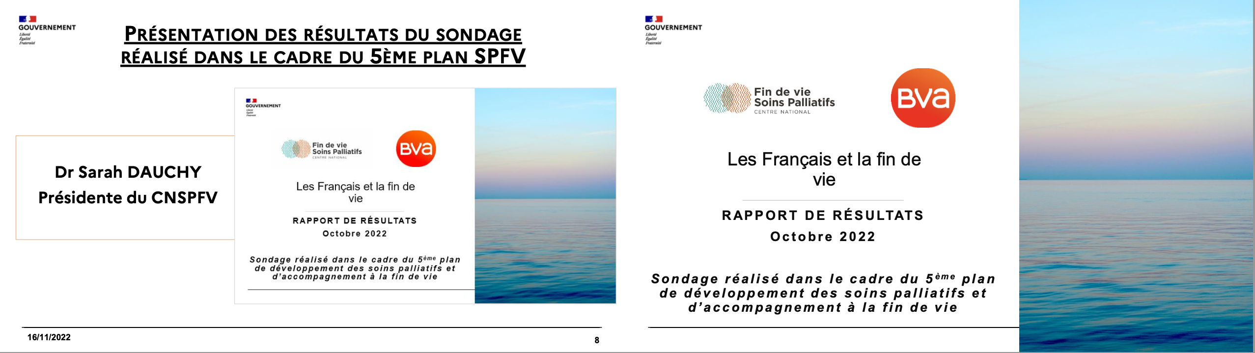 Exposé de l’Avis 139 du Comité Consultatif National d’Éthique (CCNE) sur les « Enjeux éthiques relatifs aux situations des fins de vie » avec la réflexion éthique et les évolutions législatives, les problématiques et les recommandation du CCNE suivi de la présentation des résultat du sondage réalisé dans le cadre du 5ème plan Soins palliatifs et Fin de Vie (SPFV).