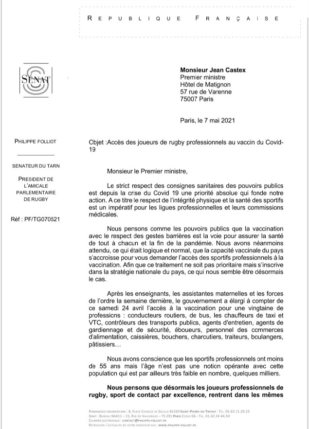 Courrier en faveur de la vaccination des joueurs professionnels de rugby