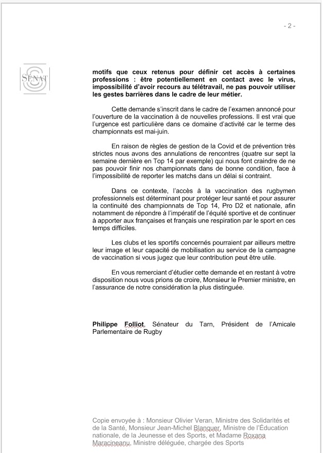 Pour cette raison, je soutiens et co-signe le courrier qui sera adressé au 1er ministre afin de permettre l’accès à la vaccination contre le COVID19 aux joueurs professionnels de rugby.