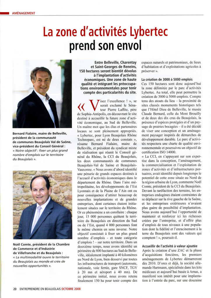 Le syndicat d’étude du Beaujolais Technoparc a laissé sa place à un nouveau syndicat de réalisation LYBERTEC que je préside avec la participation du Conseil Général pour 50 %, de la CCIVB pour 30 %, de la CCBVS pour 17 % et de la CCBV pour 3 %.